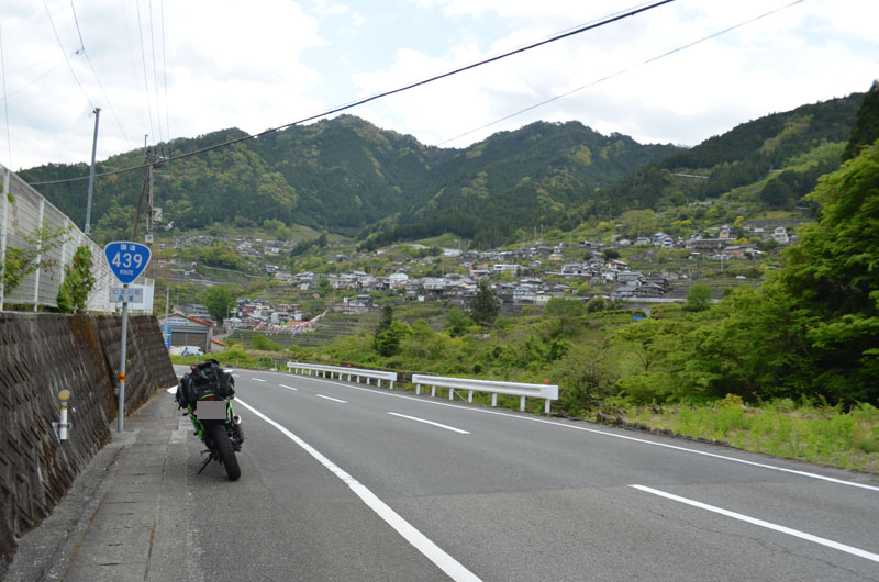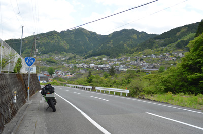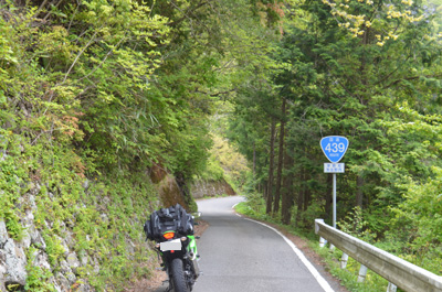 国道439号は一昨年に走った道だ。国道33号と合流するまでは写真のように一車線が大半で対向車とすれ違うこともほとんどない。こんな狭隘道路を走る物好きはあまりいないだろう。 |
