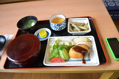 | 土佐さめうらのレストランで遅い昼食を取る。頼んだのは与作コロッケ定食(650円)。昨日の昼食と違ってシンプルな定食だ。実は名物料理らしいものがこれしかなかった。何が与作なのかは知らないが、他に与作ラーメンや与作カレーと書かれていたら多分そっちを頼んだと思う。(笑) 味は普通に美味かった。(でもコロッケ1個だけというのはかなり寂しい。値段相応やね) |