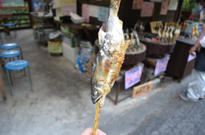 かずら橋に向かう途中、鮎の塩焼き(500円)が売っていたので、ついつい購入する。味はGOOD。(まあ、よほどでなければ外れはないと思う) 川魚の中ではウナギに並んで好きな魚だ。皆、大体同じだろうけど。 |