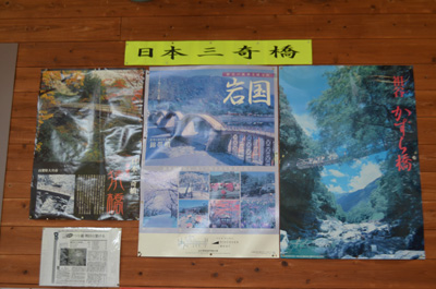 | 土産コーナーの一角のポスターにて。かずら橋は日本三奇橋の一つらしい。こんな三大があるとは知らなかった。岩国の錦帯橋はもちろん歩いているが、もう一つは山梨県大月市にある猿橋という橋らしい。 |