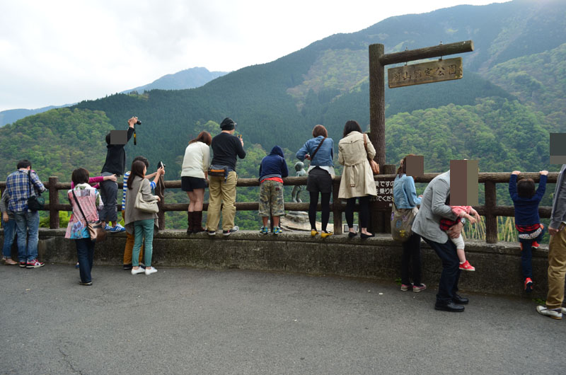 5キロぐらい進んだところにホテル祖谷温泉が建っていて(こんな断崖絶壁によく造ったものだ)、そこから先の小便小僧像には人だかりが出来ていた。 |