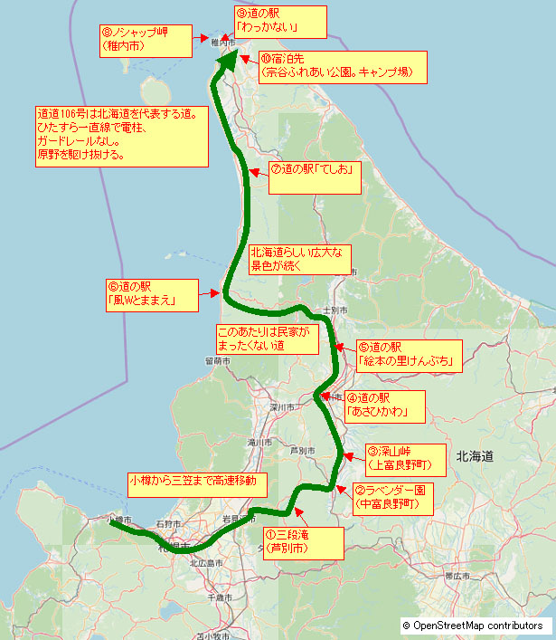 ルートは昨日直前で決めたとおり、最初に小樽から道央自動車道で富良野に向かう。朝の風が気持ち良い。3シーズン(春夏秋)ジャケットだが、思ったより寒くなくて一安心。気温が一番低い早朝の高速移動で問題ないので今後も大丈夫だろう。