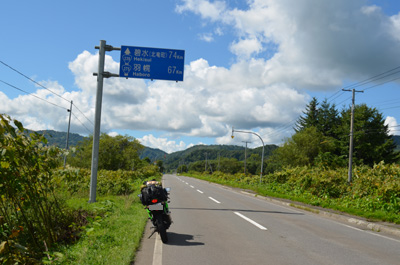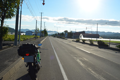 北海道での晴れの時間は貴重。すぐに出発準備をしてホテルをチェックアウトする。バイク置き場はまだ駐車場全体にロープが張られていた。