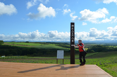 上富良野の先の深山峠で写真撮影。9時10分前だが、気温がぐんぐん上昇してきた。空は若干雲が目立つが、白い雲に青い空なので気持ち良い。天気が良ければ9月とはいえ北海道も暑い。 |
