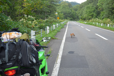| 国道239号はツーリングマップルに記載されているとおり、民家がまったくない山中の道(道路は綺麗に舗装されている)で、四国カルストに向かう林道や、長野の野沢温泉から志賀草津道路に向かう林道に似ている。国道なのに携帯電話も圏外になる山の中だが、道路自体の走りやすさは申し分ない。走っている途中、キタキツネを発見! |