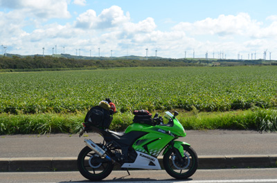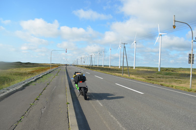 | 山中を抜けると苫前町に入り、草原が広がってきた。向こう(留萌側)に風車が見える。北海道は広大な土地で風も強いのでいたるところで風車を見ることができる。(実は後で知ったのだが、この4日前の9/5に羽が落下したとか) |