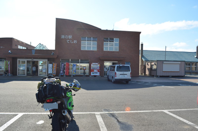 晴れと雨ではすべての見方が180度違う。晴れのツーリングなら、いくら出しても惜しくないが、雨のツーリングなら1円の価値もない。一気に走ってきて道の駅「てしお」に到着。 |