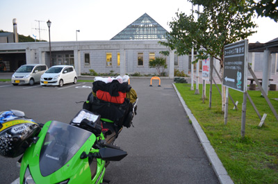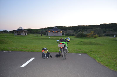 宗谷ふれあい公園はバイク乗り込み可で、受付で案内された場所までバイクで移動する。今日は誰も使用していないということで、適当な場所にバイクを停めてテントを下ろす。