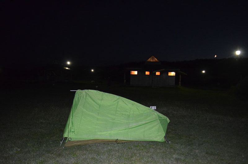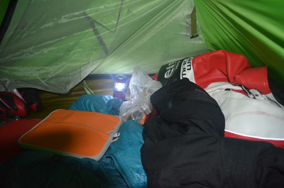 モンベルストア(キャナルシティ博多)でムーンライト2を見たときは結構広いと感じたが、荷物を入れると想像以上に狭い。テントの張り方自体も下手だから空間自体も狭くなっているせいもあると思う。でもとりあえずテントが張れた事に大満足。早速、ランタンとラジオを出してキャンプを満喫してみる。ラジオがこんなに楽しいと思ったのはいつ以来だろう。 |