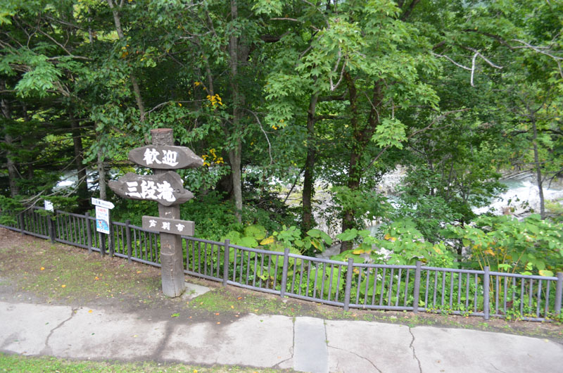 | 写真では伝わりにくいが、凄まじい勢いで水が流れていて迫力満点!こんなに流れの速い川は初めて見た。流れが速いので水が落ちる音もすごくて、ゴーーーーーーーという音が辺りの音すべてをかき消している。北海道だと、こういうところに鮭を加えた熊がいるのではないかと期待してしまう。 |
