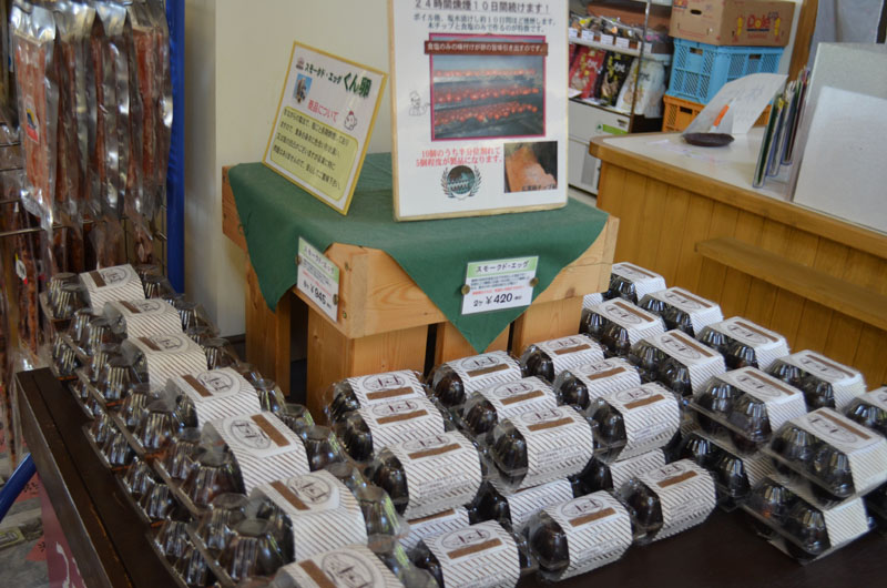 中に入るとスモークド・エッグという黒い燻製(くんせい)の卵が置いてあった。(写真右下) ピータンみたいだが、スマホで調べたら結構ウマいらしいので、今思えば土産で購入しておけば良かったかも。 |