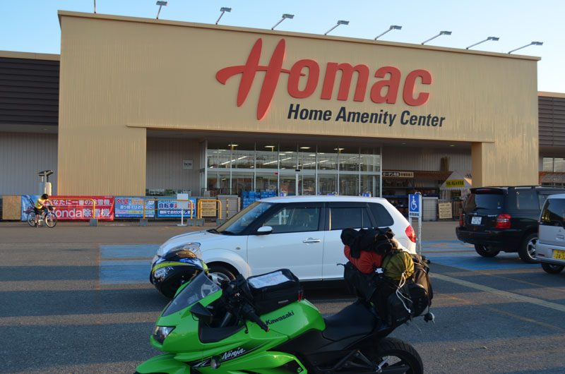 | そろそろ陽が暮れてきたので事前に調べておいたキャンプ場「宗谷ふれあい公園」を目指す。そういや、テント設置に必要なゴムハンマーとペグ抜きを買い忘れたことを思い出した。ホームセンターならキャンプ用品を売っているはず・・・と、ナビでホームセンターを調べてやってきた。北海道のホームセンターといえばホーマック。 |