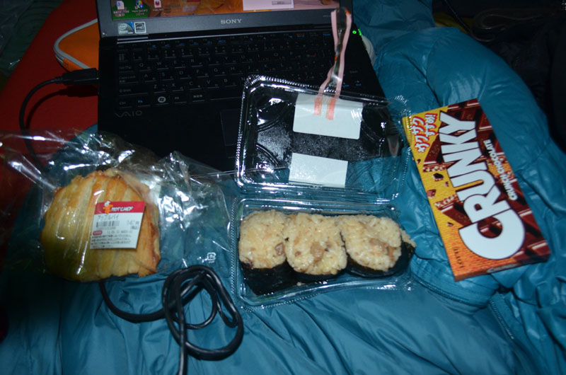 | 今日の食事はさっきセイコーマートで購入したおにぎりとアップルパイとクランキー(板チョコ)。昼に食べたものと比べると寂しい気もするが、キャンプ場で食べるととてもウマく感じて結構病み付きになりそうな気がする。 |