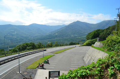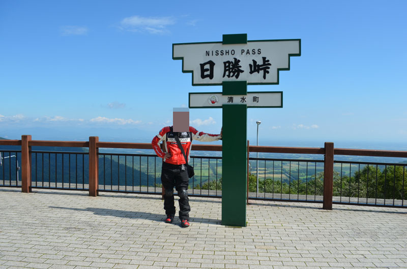 | 同じペースで付いてきたライダーと挨拶を交わし、先に三脚をたてて写真撮影。天候が良い日勝峠は貴重らしい。ライダーのナンバープレートを確認すると「岩手」だった。九州人からすると岩手と北海道は比較的近いと感じるが地図を見ると実はかなり遠い。それだけ北海道が広いということだ。 |