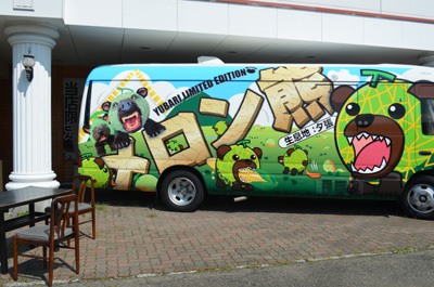 国道274号を淡々と走り、夕張市街地に近づいてきた。途中、北海道物産センター夕張店という場所で不思議なバスを見かけたので思わず写真撮影をする。このメロン熊、見事にハマっている気がする。しかも左側の熊の顔は微妙に怖いし。(笑) |
