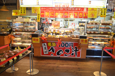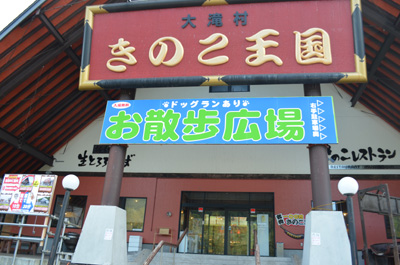 | 落胆しつつ、道の駅の横に「きのこ王国」という不思議な建物があったのでそこに行ってみる。看板のキャッチフレーズは「日本で一番売れているきのこ汁」。ほんまかいな。 |