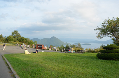 | サイロ展望台にて。洞爺湖といえば2008年にサミット(主要国首脳会議)が行われた場所として有名。洞爺湖の真ん中に浮かぶ中島が特徴的であり、かつ周辺は温泉も湧き出ていて道南地区屈指の観光地になっている。個人的には昨日行った摩周湖よりこちらの方が見応えがあると思う。 |
