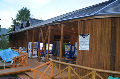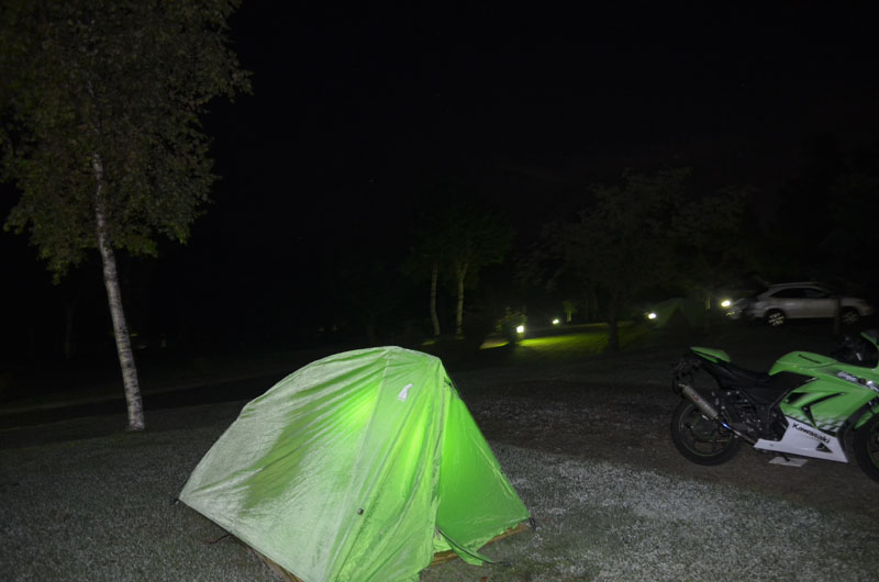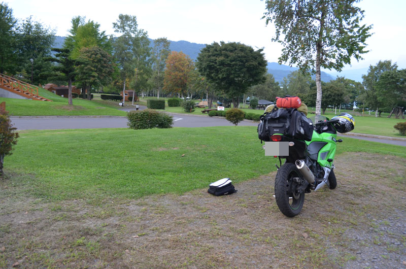 | キャンプ場使用料は800円。今日は空いているのでバイクエリアではなく、受付横のエリアを使わせてもらえるとのこと。バイクも横付けできるしラッキー。 |