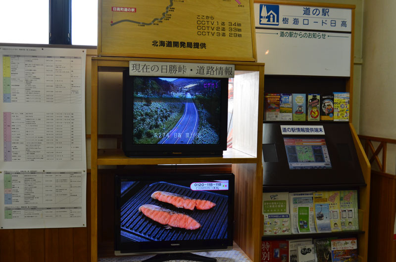 日勝峠を降りてきた先の道の駅「樹海ロード日高」にて。一昨年はここで日勝峠の路面凍結情報を見て占冠(しむかっぷ)から高速道路経由で十勝清水に出た。積雪の心配不要のこの時期にも日勝峠の状況が放送されていた。