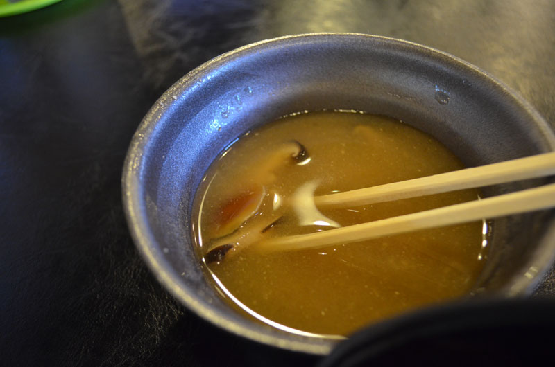 | 既にお腹はいっぱいだが、せっかくなので日本一売れているきのこ汁を注文してみる。(豚丼に付いていた味噌汁もきのこだったのでこれで2杯目)出てきたきのこ汁を食べると、これが美味い。味噌は少し辛いが、しめじ、しいたけ、まいたけが入っていた。 |
