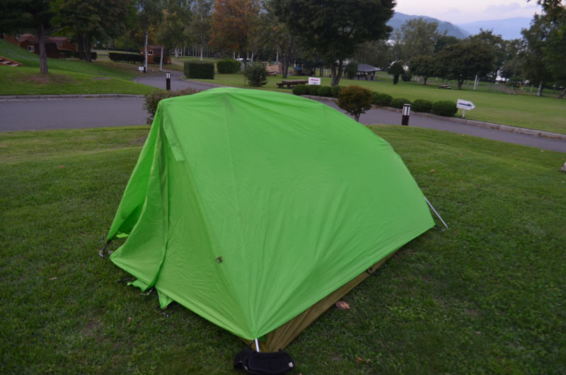キャンプも3回目ともなると組み立てもスムーズになる。そういやこのキャンプ場、芝生が少ないせいか、「宗谷ふれあい公園」や「国設知床野営場」のように蚊がまったく襲ってこなかった。おかげで蚊取り線香の出番はなし。あっという間にテントが組みあがった。(途中、会社から電話があって電話しながらのテント設置となったが) |