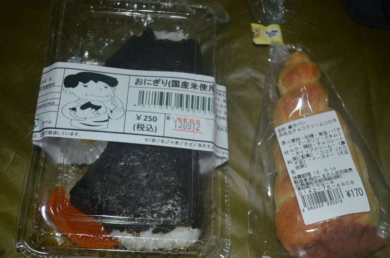 | コインシャワー(有料。100円)が設置されていたのでさっそく利用する。今日は汗を流すことができた。(^_^)/ シャワーから出てくるとあたりが暗くなっていた。夕食はさっきの道の駅「とうや湖」で買ったおにぎり(半額125円)と菓子パン。15時に豚丼+きのこ汁(2杯)を食べたのでこれで十分だ。(このおにぎり、2つとも中の具が梅干だった。特に中身の表示はしてなかったが、せめて片方は別の具にして欲しかった) |
