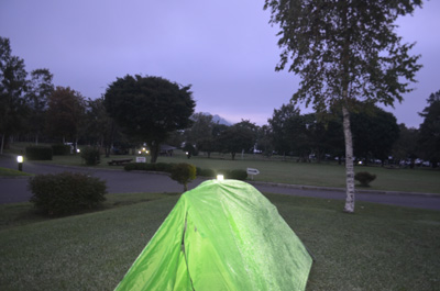 朝4:50に起床して空を見るとまだ薄暗いが晴れている様子。昨日は20時過ぎからファミリーが前のエリアにやってきて、深夜1時過ぎまで騒いでいたから、かなりうっとおしかった。まあ、ボクもラジオをつけてそのまま寝ていたのでほとんど気にはならなかったが。