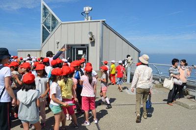 ロープウェイが頂上に到着して展望台に登っていくと、小学生の大群が。歩いても来れるので学校の遠足としても最適だろう。平日なのに本当に人が多い。 |
