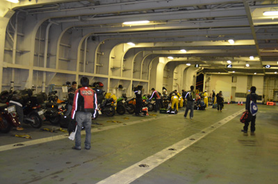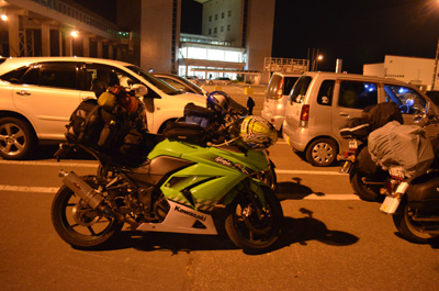 係員に誘導されて所定の場所にNinjaを停車させておく。北海道5日間、よく走った。Ninjaには本当に感謝!(いつもありがとう) 明日の夜に舞鶴に到着後、北九州までまた長距離移動になるので車体を念入りにチェックしておく。 |