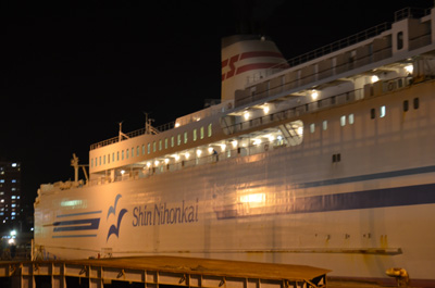 舞鶴から航海してきたフェリーが定刻どおり20:45に到着。この船が今度は舞鶴に向けて航海することになる。たった3時間弱で室内を清掃して物資や水や燃料を積み込むのだから従業員は相当忙しいと思う。 |