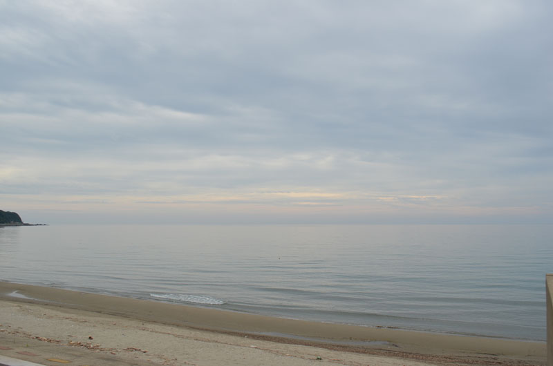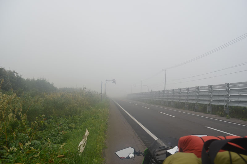 | キャンプ場を後にして国道37号で長万部方面に向かう。単調な道のりを走り続けていると急に霧が出てきて視界が悪くなるが、それ以上に困ったのは冷気。レザージャケットの下にTシャツを着込んでいるが、それでも寒くて震えてきた。 |