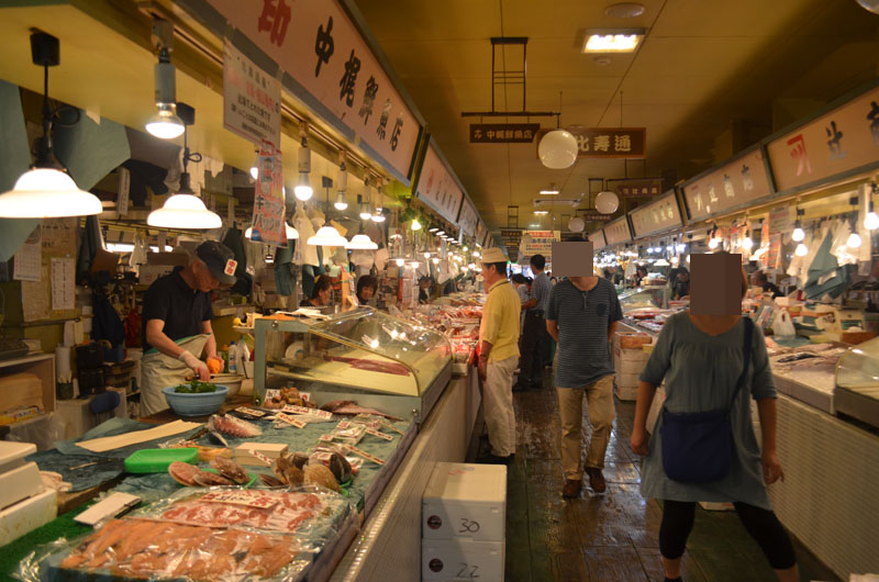市場に入ると海の食材が所狭しと店頭に並べられていた。ツーリングマップルを見ると、ここで購入した材料を丼にしてくれるとの事だったが、係りの人に聞くと店内の材料を使った食堂があるとのことでそっちに行ってみることに。 |