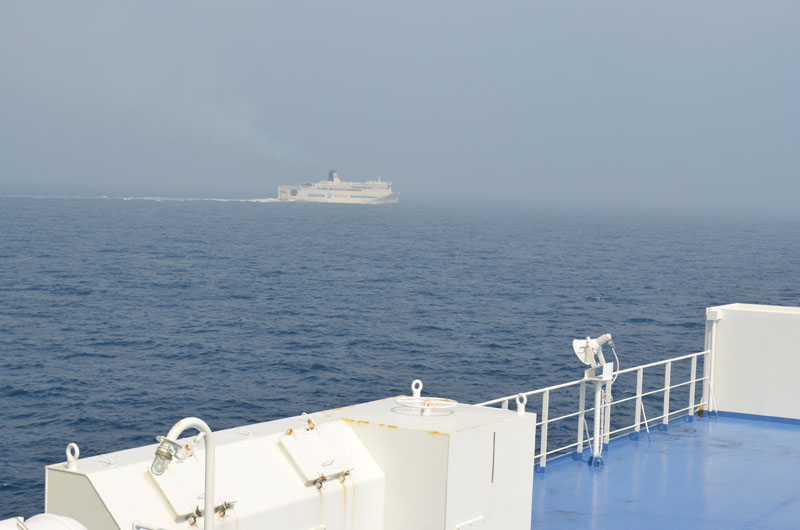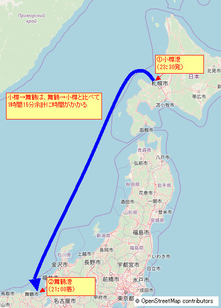 10時20分過ぎ、館内放送で舞鶴から小樽に向かう「はまなす」と擦れ違うという放送が流れたのでデッキに行ってみた。確か往路のフェリーは「はまなす」だった。今乗っている「あかしあ」も「はまなす」もまったくの同型で姉妹船らしいが、どちらが姉なのかは知らない。