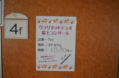 10時半になって5Fカフェルームに行くと、まだビンゴゲームをやっていた。(ビンゴ開始は10時から) 今回はビンゴゲームをパスした。これだけの人数で1等が当たる気がしなかったので。ビンゴゲームが長引いていてクラリネット演奏者が横で待ち構えていた。 |