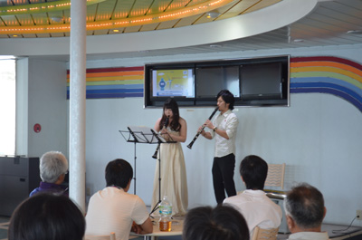 | ビンゴゲームが終わり、クラリネット奏者の演奏が始まる。まったく聞いたことがない曲や有名どころの曲など数曲ほど演奏する。そうそう、ボクは中学生の時は吹奏楽部でトランペットを吹いていたのだ。あれからまったく吹いていないし、もう吹けないと思うが。 |