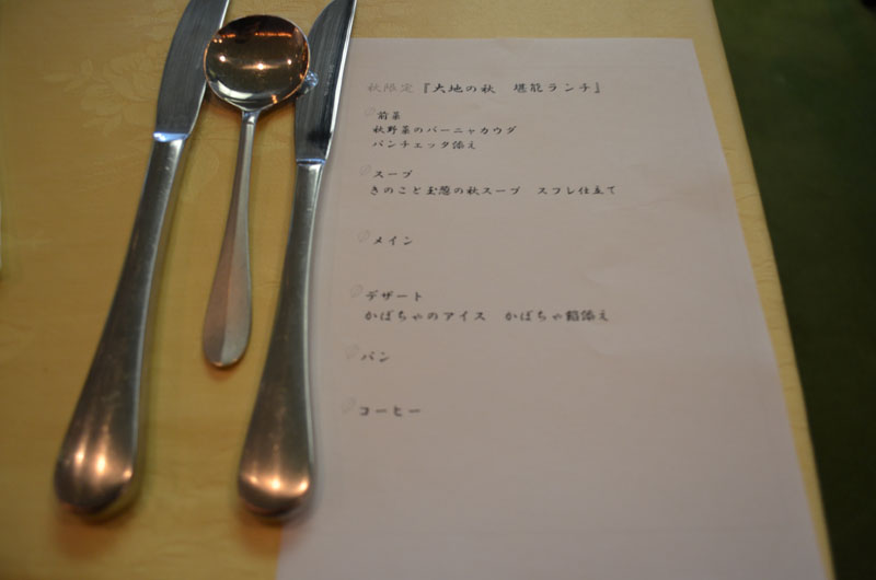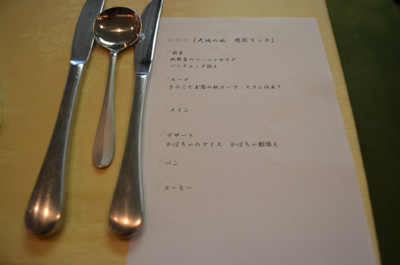 | コース名は「大地の秋 堪能ランチ」。(洋食) メニューは往路のフェリーで写真を見ていて確認済み。ボクは和食より洋食の方が好きなのでランチコースは楽しみだが、同じく洋食コースが好きな嫁には内緒にしておこう。 |