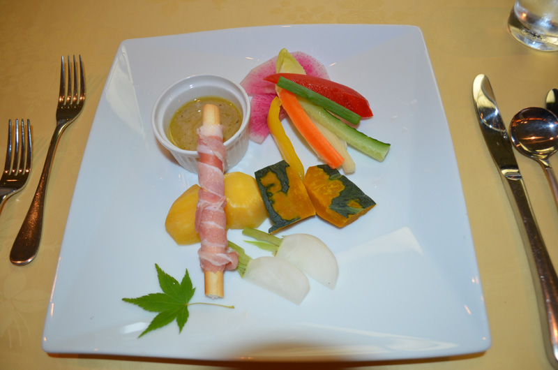 前菜は秋野菜のバーニャカウダ。パンチェッタ添え。う~ん、よくわからないが、野菜の味は純粋に美味い。ソースが甘いような酸っぱいような味で不思議な味だ。かぼちゃが特に美味しかった。