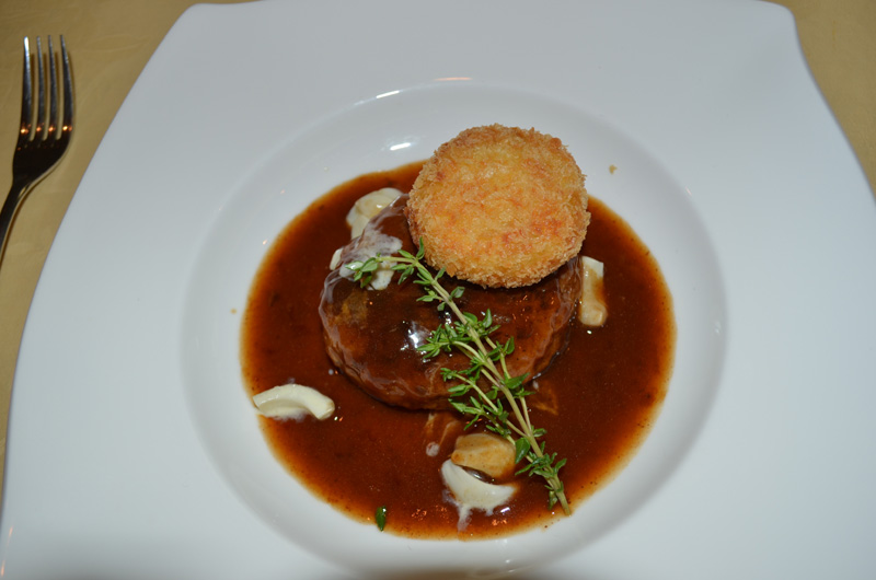 メインの煮込みハンバーグ フォアグラコロッケ仕立て。フォアグラのコロッケをスープにつけて食べるとコロッケがまろやかになってとてもいい感じ。ハンバーグもすごくやわらかくてあっという間に食べてしまった。