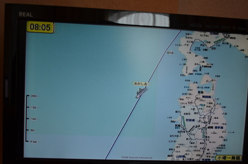 朝8時過ぎに起床。振動が心地良くて熟睡することができた。フェリーはちょうど青森県から秋田県に入ろうとしているところ。昨日はツーリングレポートを書いている途中に力尽きたらしい・・・。