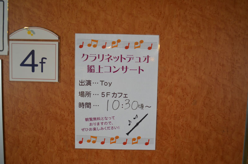 | 10:30から船上コンサートが開かれるらしい。阪九フェリーでも似たようなコンサートをしていた。後で見に行ってみよう。 |