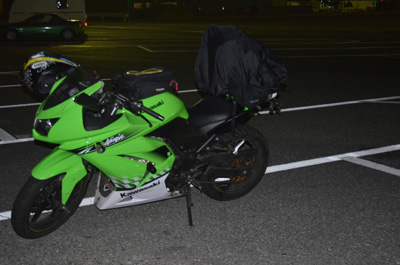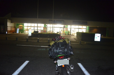 どれだけ寝ただろうか・・・。気持ちよく寝ていると、顔にポタポタと水滴が落ちてきた。どうやら雨のようだ。完全に目が覚めた。すぐにNinjaまで行って荷物を確認すると特に何もされておらず一安心。一応、防犯用と雨用の対策としてシートバッグにカバーを掛けておいたので。時計を見ると3:52。2時間近く完全熟睡していた。雨はすぐに止んたので、ボクを起こす雨のようだった。 |