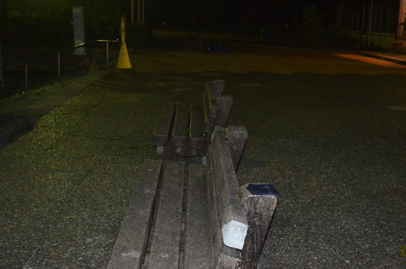 よく見ると、前の前のベンチの下に地べたで倒れこんでいる人がいた。(死んでいるわけではなく、眠っていたようだ)