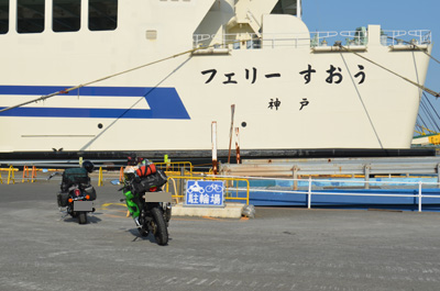 乗り場に到着すると係員に乗り込み口の前まで移動するように指示され、Ninjaを置いて受付に向かう。写真前のフェリーは神戸行きの船。ボクが乗るのは写真に移っていない右のフェリーとなる。 |