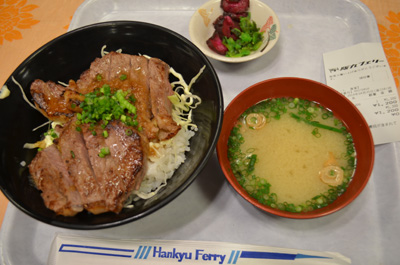夕食は定番のステーキ丼。(1200円) 阪九フェリーに乗るといつもこれ。2週間前に乗った神戸行きでも食べたばかり。昔は神戸行きと泉大津行きでメニューが異なっていたが、最近は統一されているようだ。