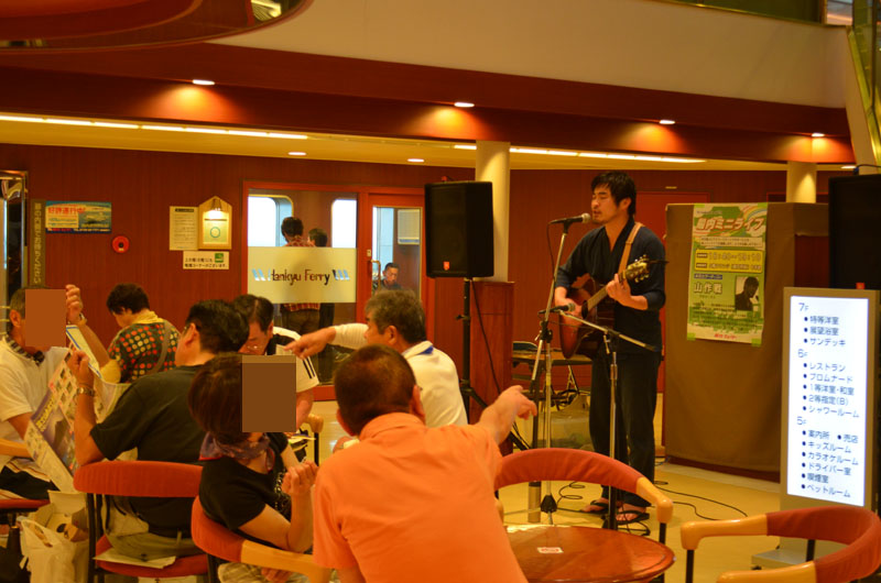 | 出航してしばらくすると船内ライブが始まった。そういや2週間前に乗った神戸行きにはなかった。 |