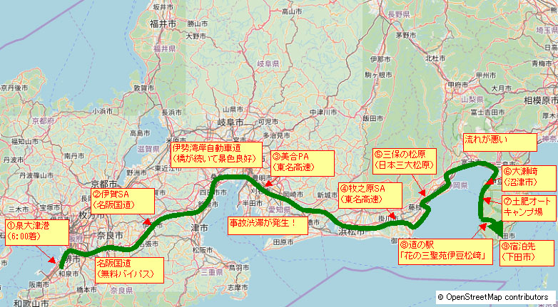 最初、泉大津から名神高速(吹田JCT経由)で名古屋に向かうと思っていたが、ナビが指示するのは奈良方向。事前に地図を確認したとき奈良方向は途中で高速が切れていたと記憶する。