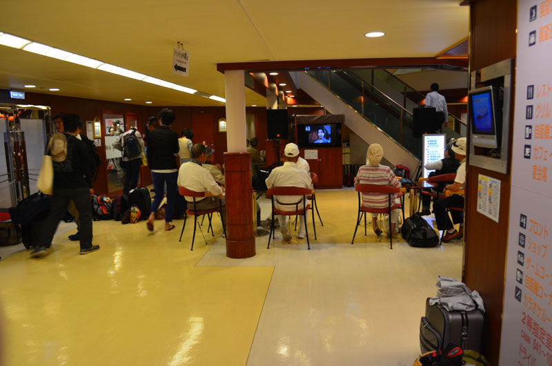 顔を洗って出発準備をしてロビー前で船内放送を待つ。トイレに行くときに二等室の前を通過したが、二等室は年配の団体客に占領されていた。二等室でも仲間内なら楽しいだろう。