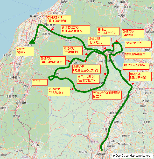 さて今日はどこに泊まろうか・・・。今日も目ぼしいキャンプ場には行けそうにないし(魚沼か上越で予定していた)、明日は雨が降りそうなので結局ビジネスホテルになるのだが、新潟市周辺なら色々ありそうなので、とりあえず会津若松から高速に乗って新潟に向かうことにする。 |