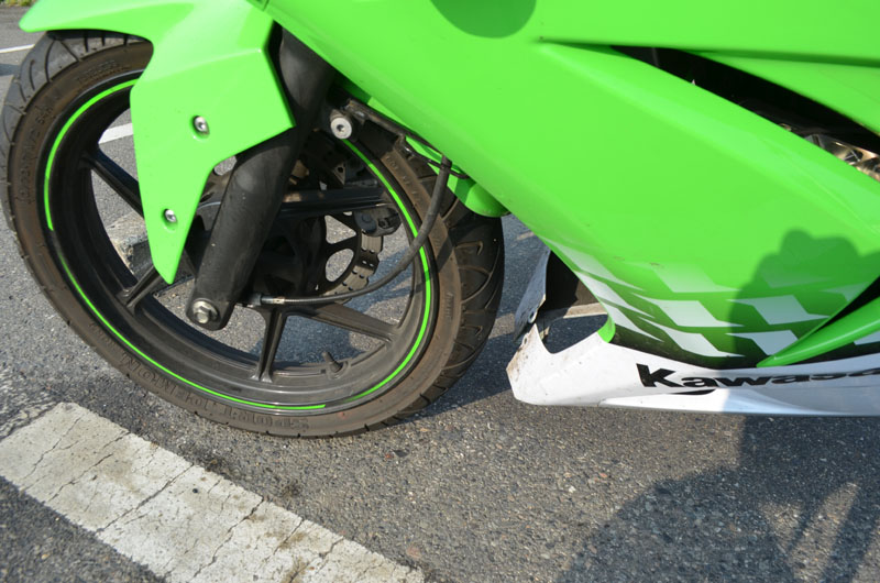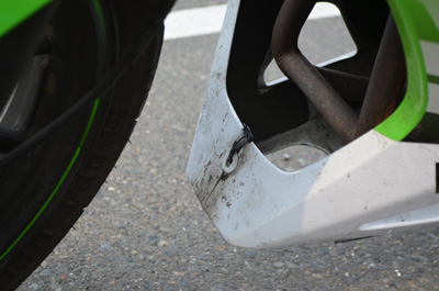 Ninjaを発進させようと前に進んだ瞬間、「バリバリバリ!」と、けたたましい音が響いたので思わずNinjaを停止すると、何と下のカウルが破損しているではないか!あまりの出来事に何が起こったのかわからなかったが、どうやら前にあった縁石に気づかずに乗り越えてしまったらしい。あ~、やっちゃった。 |