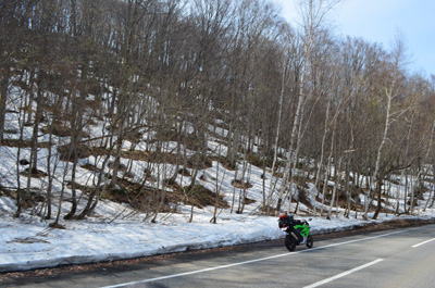 峠道の連続だが、山奥を走るというより、開けた場所を走るのがほとんどなので、雪崩の怖さもなかった。バイクもちらほら目立つが、基本、クルマもバイクも通らない。 |